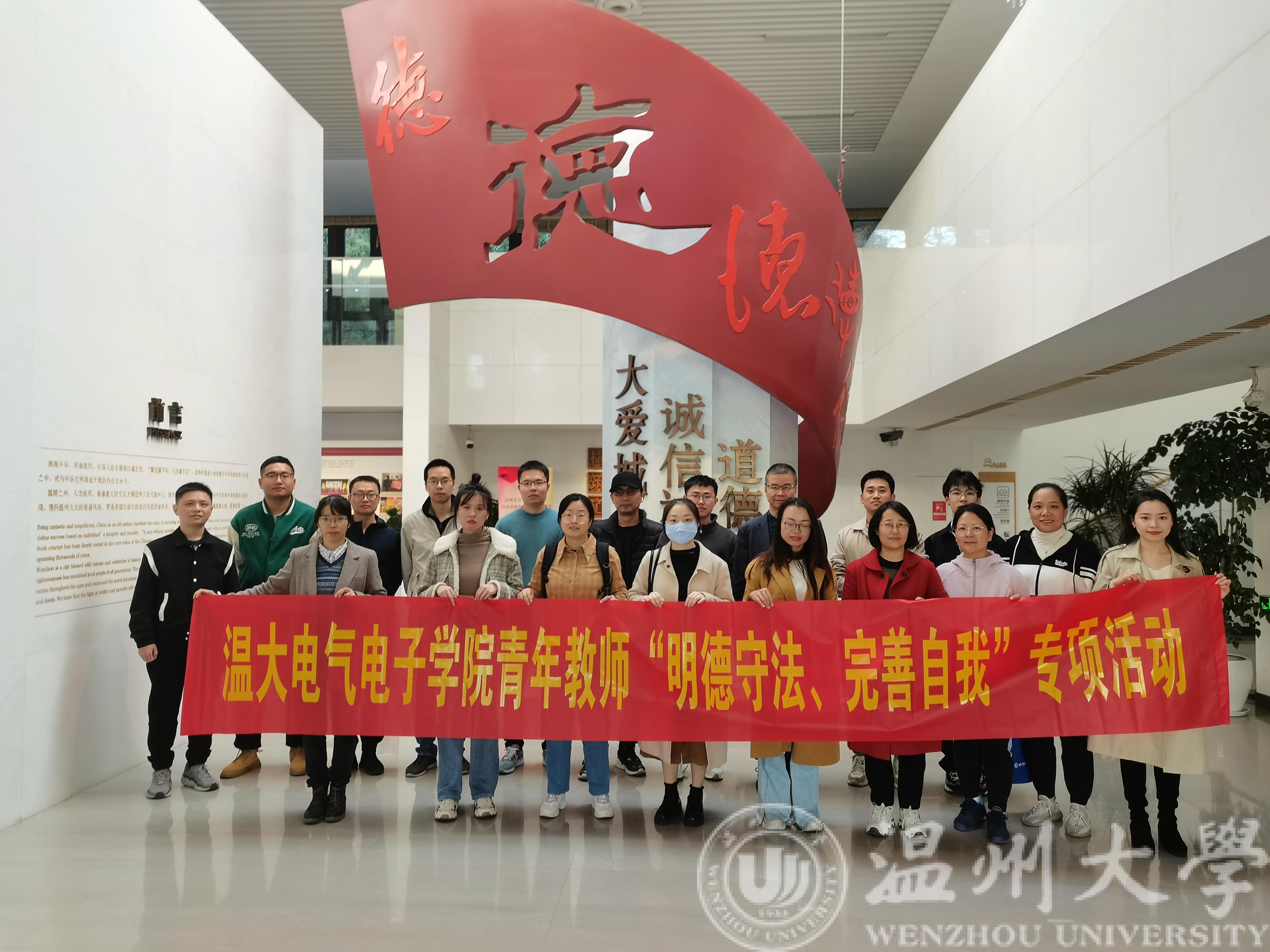 为深入学习贯彻习近平新时代中国特色社会主义思想和习近平总书记关于加强年轻干部教育管理监督重要指示精神,11月22日下午,区块链游戏 组织20余名青年教师赴温州道德馆开展“明德守法、完善自我”主题教育专项活动,引导青年教师坚定理想信念、涵养道德操守、严守纪法规矩。