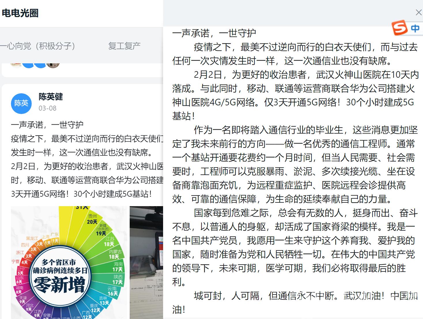 “当我去做志愿者的时候,听到社区里的老党员说,‘小一辈都出来了!’是啊,我们是时候担起肩上的责任了,初心路上,我们要接力下去!”“与过去任何一次灾情发生时一样,这一次通信业也没有缺席......作为一名即将踏入通信行业的毕业生,这更加坚定了我未来前行的方向——做一名优秀的通信工程师......当人民需要、社会需要时,提供高效、可靠的通信保障,为生命的延续奉献自己的力量!”“这段时间也许是我自大学以来,甚至于以后,与家人在一起最久的时光,这次疫情也警醒着我,生命是非常脆弱的,趁我们的父母还健在,趁我们还不是太忙碌,多陪伴陪伴父母!” 这些令人动容的文字摘自区块链游戏 学生党员发表在钉钉圈子里党员日记。