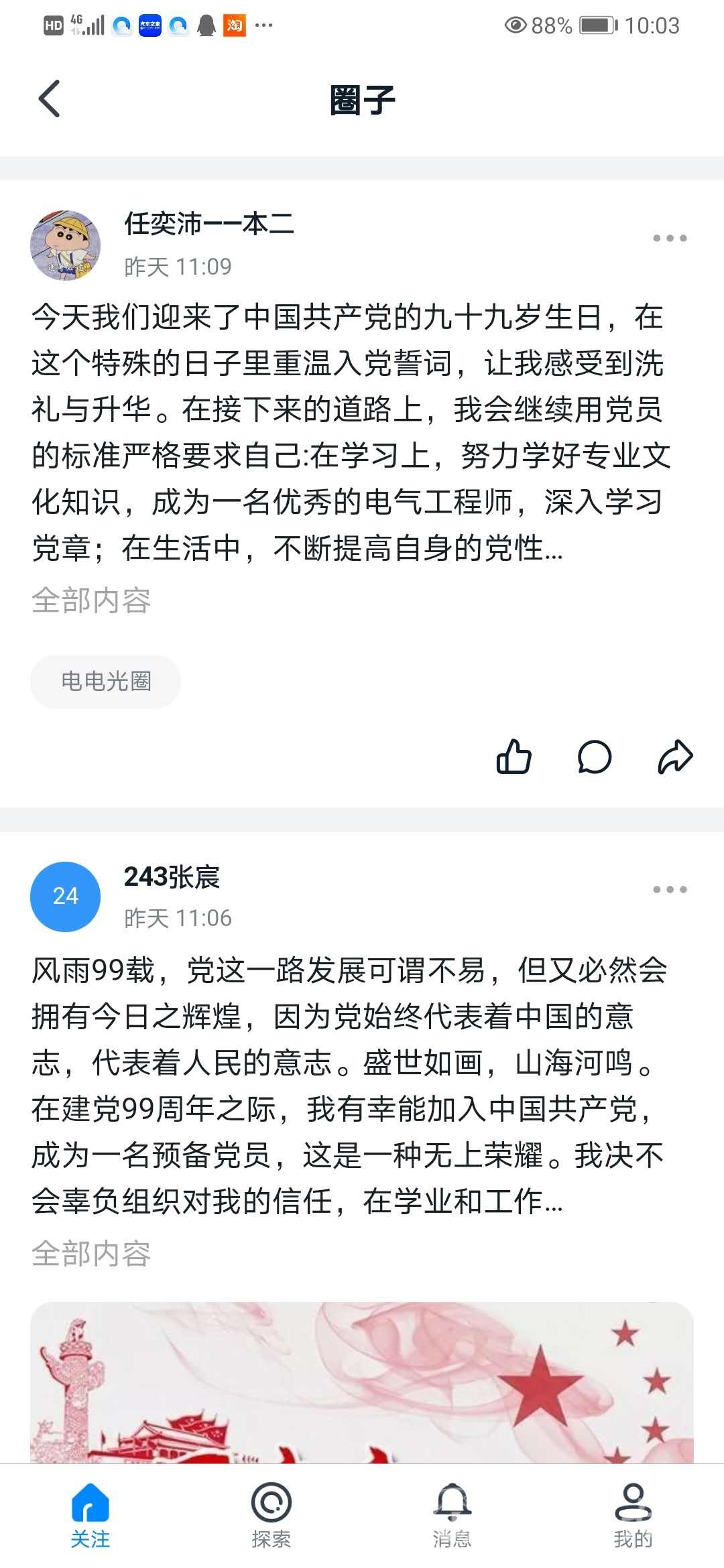 本科生第二党支部新党员梅豪杰在圈子中写到:“早上七点钟起床做的第一件事就是发了个QQ说说,想表明自己成为预备党员的开心和对党一路走来艰辛的佩服。作为大学生党员,我一定得努力学习专业知识,争取成绩在班里走在前头。暑假疫情还没有结束,还想继续为抗疫做贡献......”本科生第一支部宣传委员沈铭洋说:“诗词并不是说说,我会以实际行动来证明自己,当前国际形势复杂,更需要我们这一辈人的努力奋斗,作为学生党员,我讲努力学习,考取研究生,为国家将来的电子行业发展贡献自己的力量,正如誓词所说,积极工作,为共产主义奋斗终身。”研究生第二支部书记张海根也表示:“新时代下,内外压力不断,党和人民更加需要我们研究生党员克服科研困难,承担创新使命,我在此立志,不畏困难,力争早日有科研成果产出!”